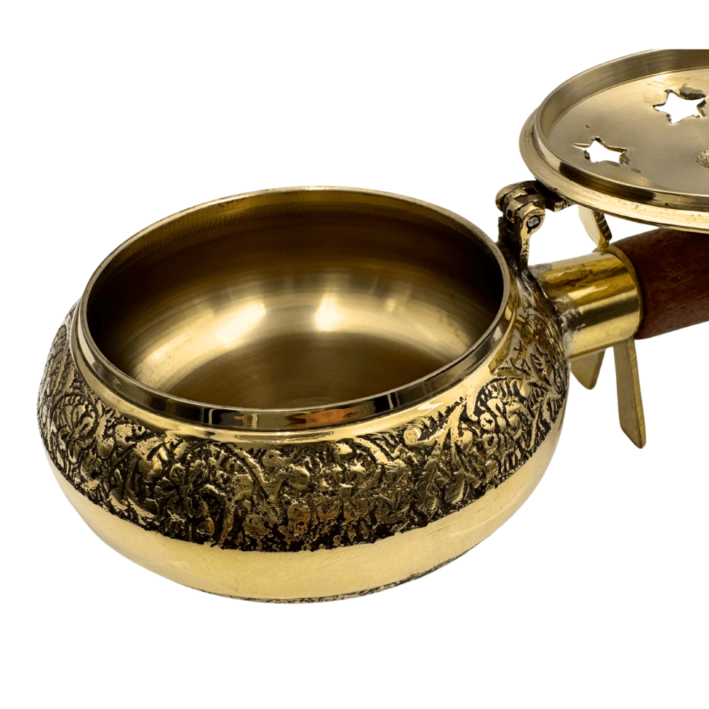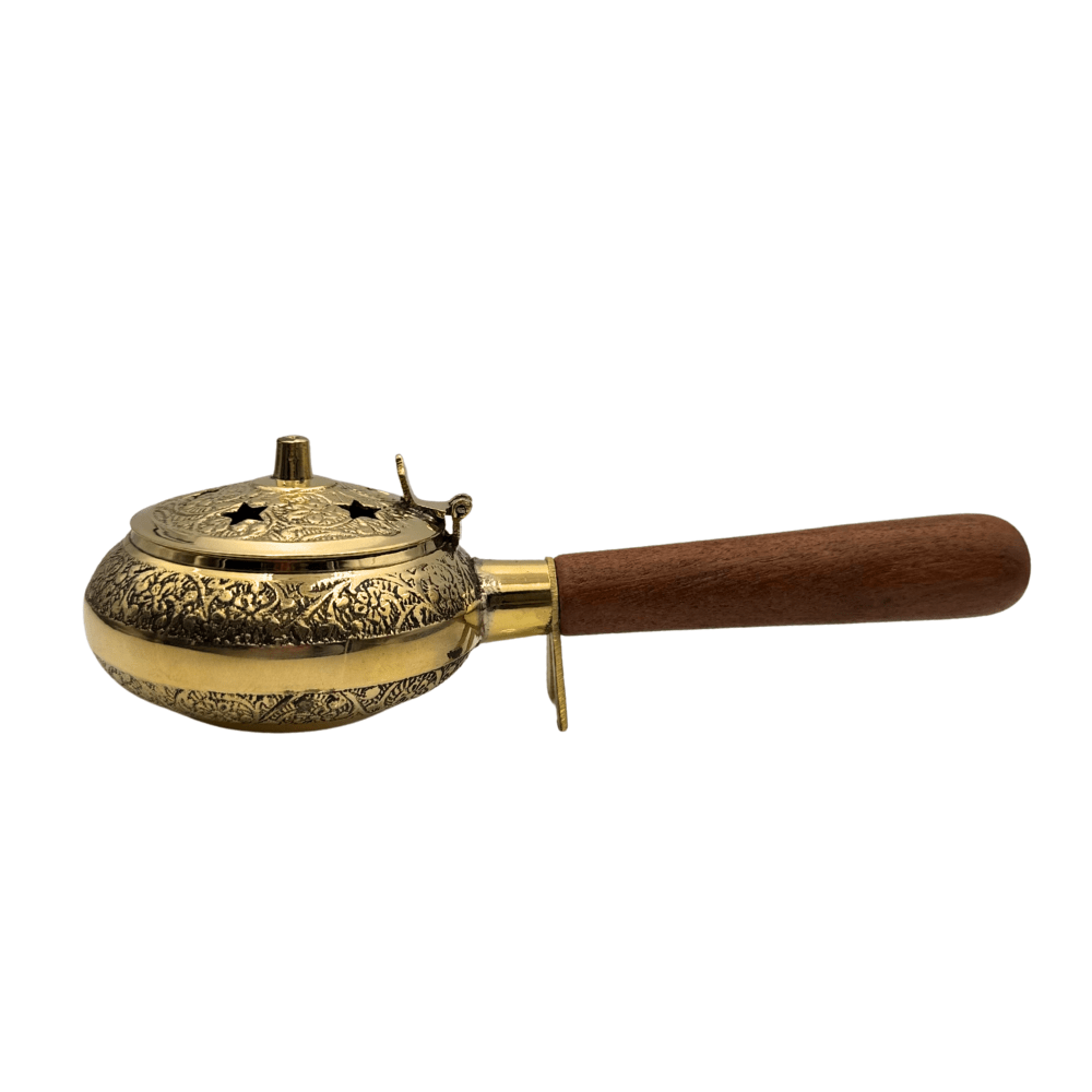 Gefertigt aus glänzendem Messing und ergänzt durch einen geschwungenen Holzgriff, bietet diese Pfanne nicht nur ein edles Erscheinungsbild, sondern auch eine praktische und sichere Handhabung beim Räuchern mit Kohle. Das Messing sorgt für eine gleichmäßige Wärmeverteilung, sodass sich Harze, Kräuter oder Räuchermischungen ideal entfalten können. Der Holzgriff liegt angenehm in der Hand und schützt zuverlässig vor Hitze.